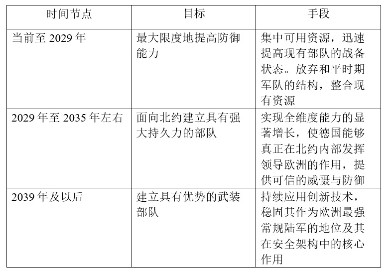战略的落地需要详尽的资源规划。《能力图谱》部分详细规定了联邦国防军的长期建设计划。面对紧迫的威胁,德国设计了一个阶梯式、分三阶段的军力跃升路径: