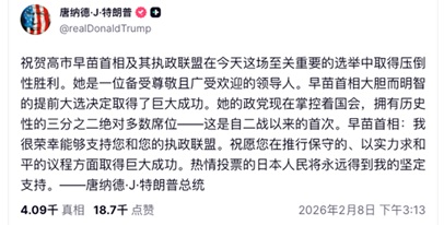 高市的胜利,首先获得特朗普的高度赞赏和支持,今年三月高市访问华盛顿,必将受到最高规格的待遇。