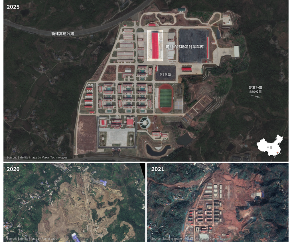 据美国国防部估计,掌控中国核导弹和常规导弹的火箭军已在四年里增加了近50%的武器储备,让导弹数量达到了约3500枚。虽然尚不清楚目前有多少枚导弹部署在东海岸,并以台湾为目标,但卫星图像显示,火箭军的导弹旅近年来已建造了新的、更大的基地,还建了更多的发射台。