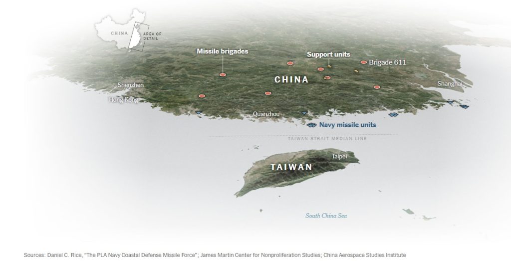 中国正在把东海岸的部分地区改造成对台湾及其附近水域进行潜在导弹打击的平台。这是对实现中国领导人习近平的目标至关重要的准备工作的一部分,习近平志在收复台湾,并想以压倒性力量的威胁来对抗美国在亚洲的影响力。