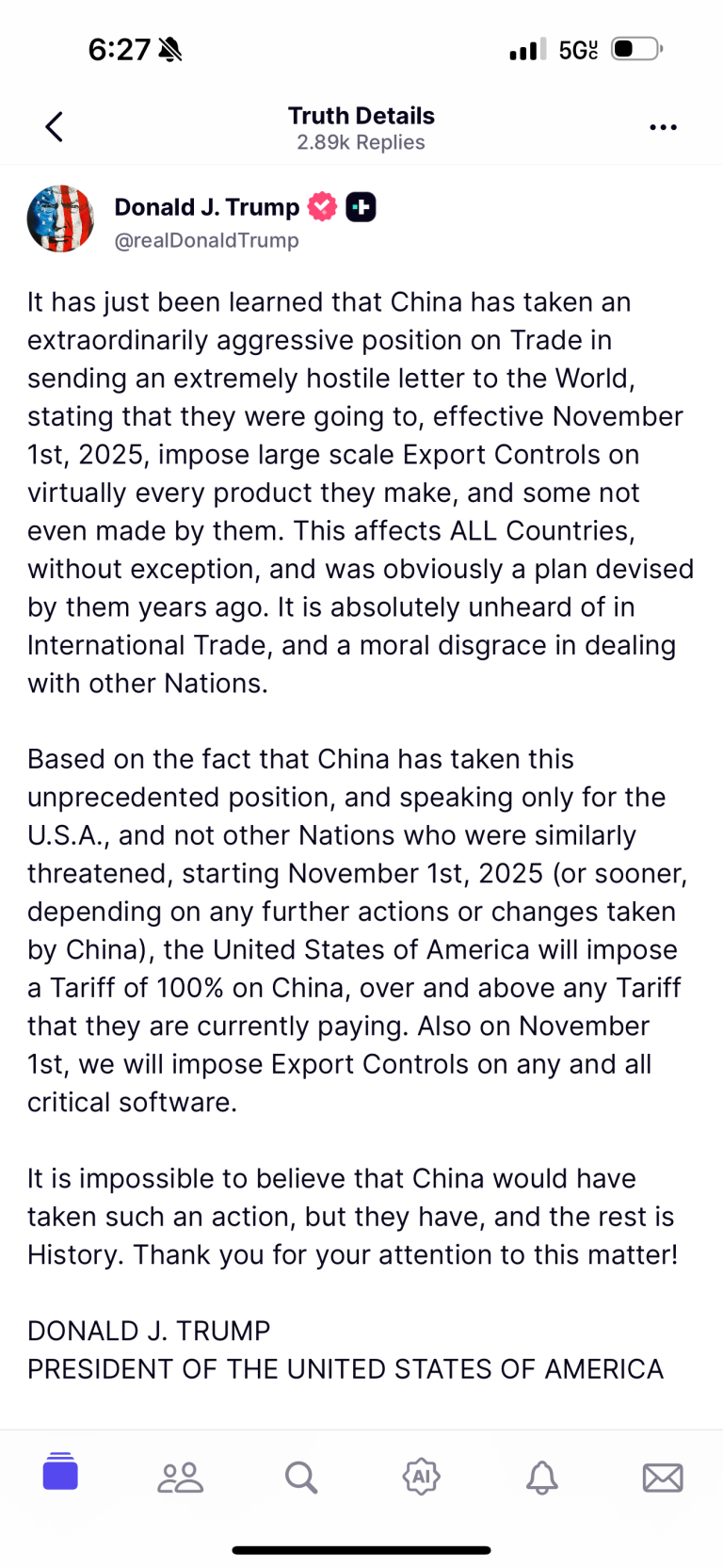 特朗普在Truth Social上写道,新关税将于11月1日生效,并将在现有关税基础上“叠加征收”。目前美国对中国出口商品的关税已达30%,某些商品甚至更高。他还表示,美国将对关键软件实施出口管制。