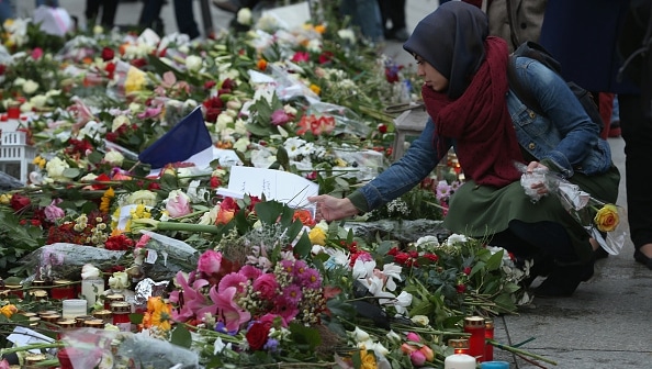 BERLIN, GERMANY – NOVEMBER 16: A young Muslim woman reads a message outside the French Embassy among candles, messages and flowers left 查看全文