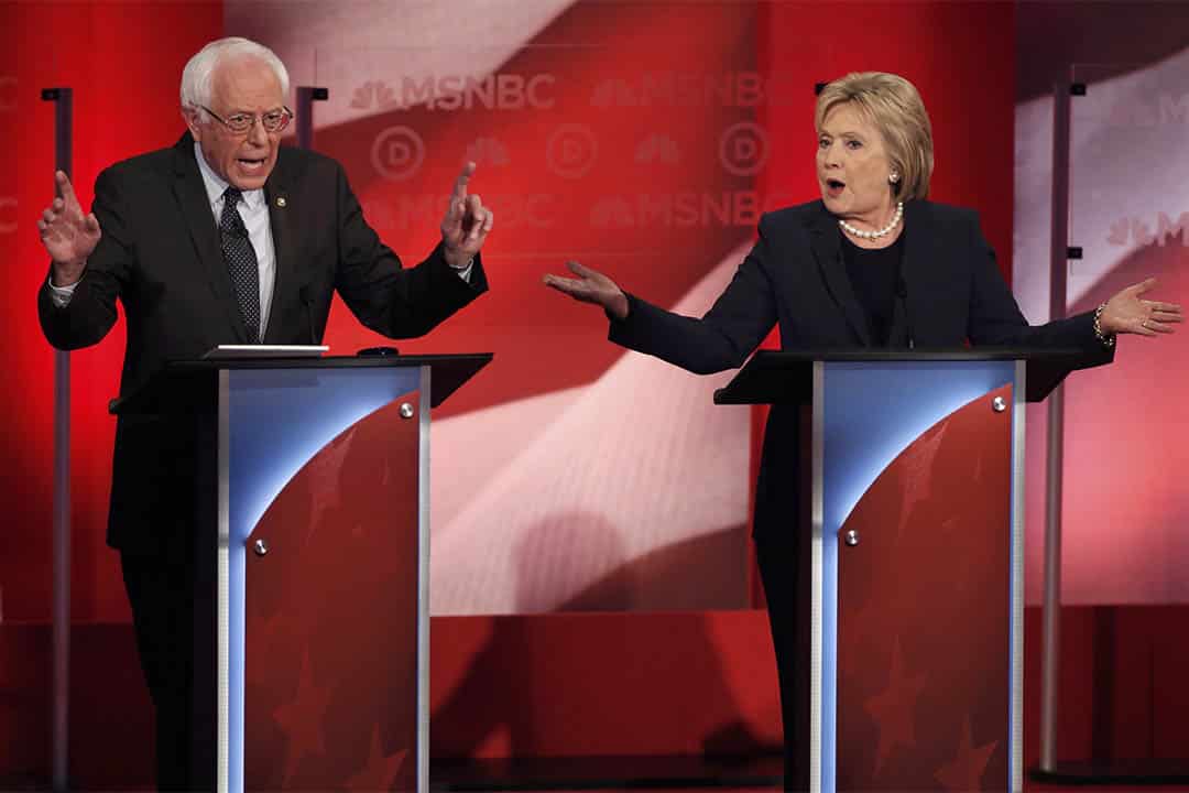 Democratic U.S. presidential candidate and Senator Bernie Sanders (L) and former Secretary of State Hillary Clinton speak simultaneously as 查看全文