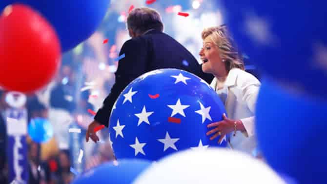 PHILADELPHIA, PA – JULY 28: Democratic presidential candidate Hillary Clinton plays with balloons on stage at the end of the fourth day 查看全文