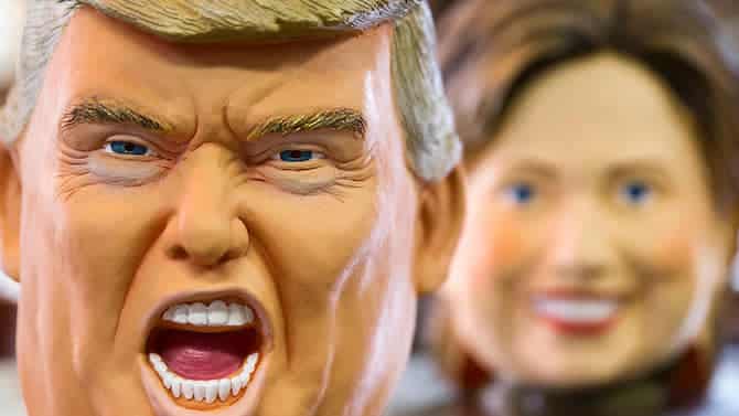 SAITAMA, JAPAN – JUNE 14: Rubber masks in the likeness of Republican presidential candidate Donald Trump, left, and Democratic presidential candidate Hillary 查看全文