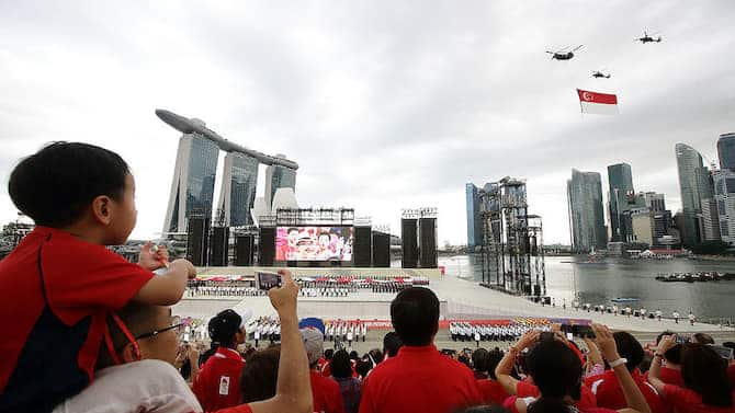 SINGAPORE – AUGUST 09: The RSAF Chinook carrying the state flag, flanked by two Apaches AH64D perform a flypast during the 查看全文