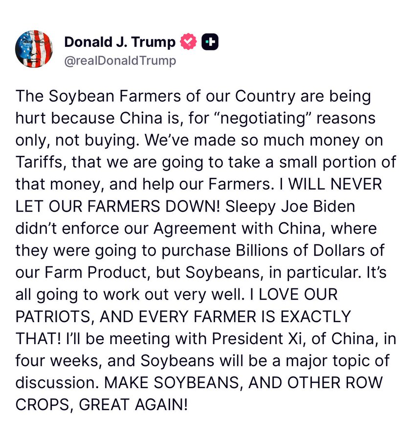 特朗普称,四个星期之后将与中国国家主席习近平见面,并明确大豆将是“主要讨论议题”。 他在8月间也曾发帖,呼吁北京迅速将美国大豆订单量增加四倍,又称中国正担心其大豆短缺。
