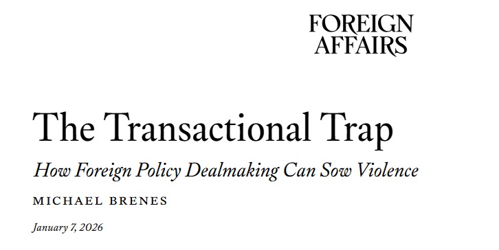 1月7日,《外交政策》(Foreign Affairs)发表题为《The Transactional Trap: How Foreign Policy Dealmaking Can Sow Violence》的分析文章。作者结合当前国际局势与历史经验,以美中关系及其博弈背景下各国的应对为例,对近年来日益凸显的“交易式”外交取向进行了系统反思。