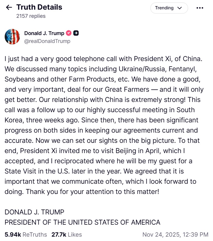 “我刚刚与中国国家主席习近平进行了非常好的通话。我们讨论了包括乌克兰/俄罗斯、芬太尼、大豆和其他农产品等在内的诸多议题。我们为伟大的农民们达成了一项意义重大且卓有成效的协议——而且未来只会更好。我们与中国的关系非常牢固!此次通话是对我们三周前在韩国举行的卓有成效的会晤的后续跟进。自那以后,双方在确保协议的有效性和准确性方面取得了显著进展。现在,我们可以着眼于大局。为此,习近平主席邀请我于四月访问北京,我已接受邀请。同时,我也回请了习近平主席,他将作为我的客人于明年晚些时候访问美国。我们一致认为,保持密切沟通至关重要,我期待着与他开展更多沟通。感谢您对此事的关注! 唐纳德·J·特朗普 美国总统”