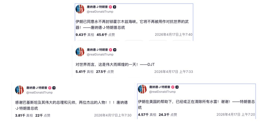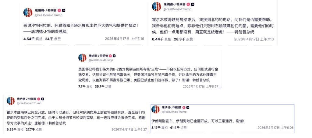 4月17日清晨,美国总统连发了9个帖子,宣布伊朗同意开放霍尔木兹海峡: