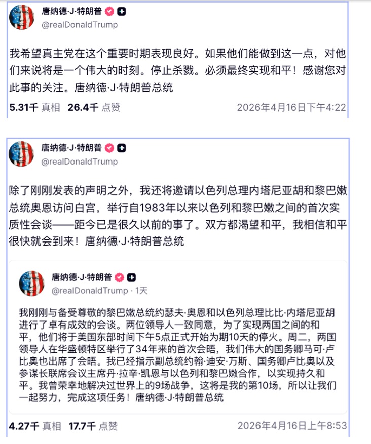 有关黎巴嫩停火,特朗普在4月16日发表了一下帖子: