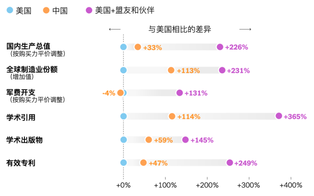 美国面临一个在多数关键实力维度上都具备更大规模优势的竞争对手——中国,这在美国现代历史上是第一次。而仅凭美国自身的国力可能不足以应对这一挑战。