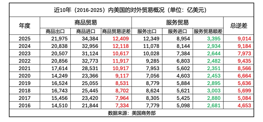 幸亏美国的服务贸易(旅游、餐饮、软件、金融、医疗等)一直处于顺差地位,2025年的服务贸易顺差也达到3395亿美元的峰值,将对外贸易的总逆差拉低到9014亿美元,仅略低于2022年的9435亿美元峰值。