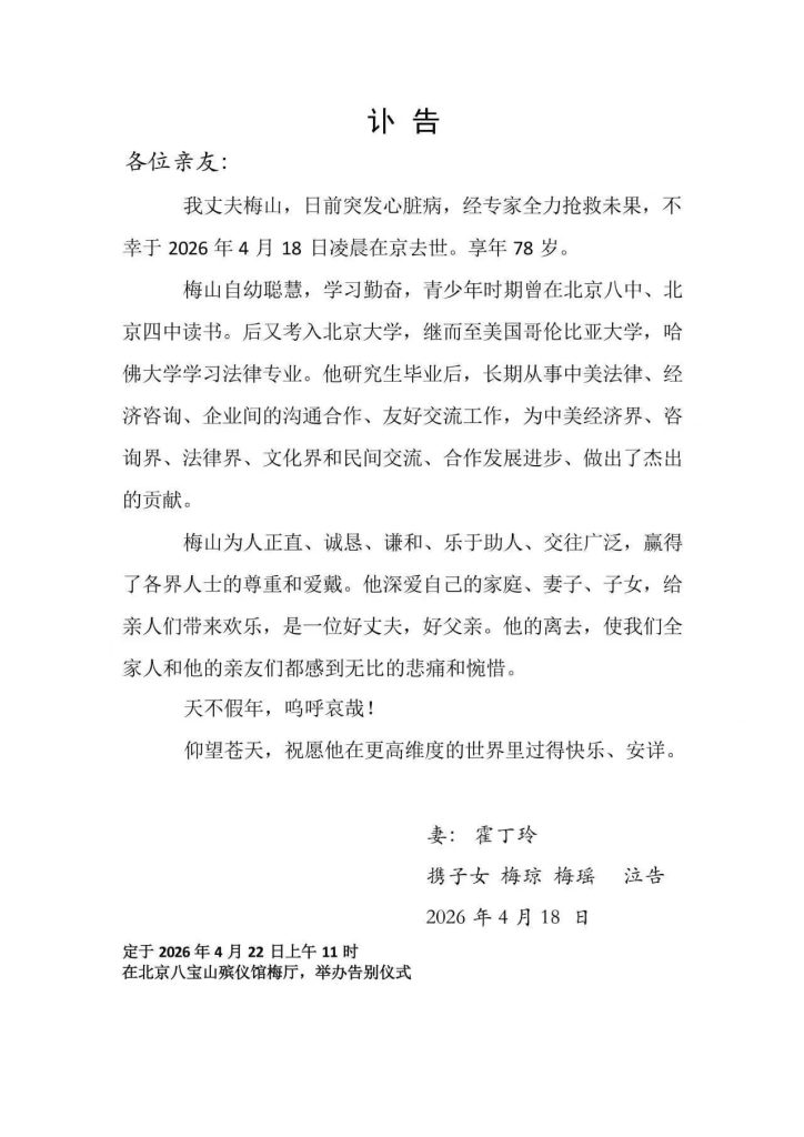 梅山(Mei Shan)在过去四十多年里,一直是中美关系中一个核心却刻意保持低调的人物。他于2026年4月18日在北京逝世,国际外交界和商界纷纷表示哀悼。财新传媒创办人胡舒立在悼文中将其描述为基辛格(Henry Kissinger)身侧“沉静的中国知己”。
