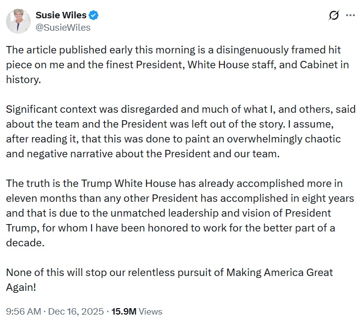 报道发布后,威尔斯在社交媒体上回应称,这是“一篇刻意抹黑我与美国历史上最优秀的总统、白宫幕僚及内阁的攻击文章”。她并未否认文章中的任何事实,仅表示“重要语境被忽略,我和其他人关于团队及总统的诸多言论未被纳入报道”。